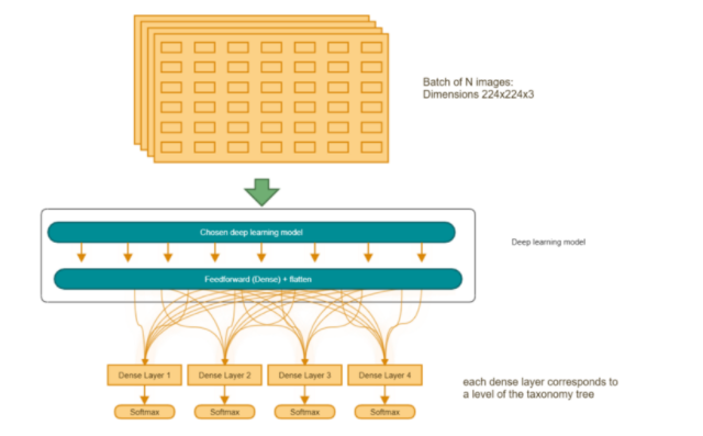 为了能够快速改变我们想要实验的神经网络,设计一个通用的架构非常重要。我们创建了一个模板,将完成层添加到所选的深度学习模型中,以便预测谷歌分类法的所有 4 个级别。这些层次根据深度进行加权,因为我们的客户希望 4 级分类高于其它任何分类。