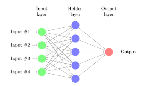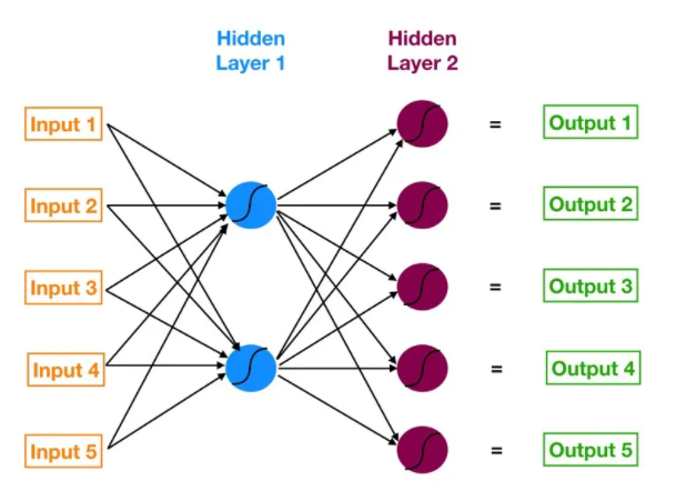 具有输入层、一个或多个隐藏层和一个输出层的神经网络称为 多层感知器 (MLP)。 MLP 是 Frank Rosenblatt 在 1957 年发明的。下面给出的 MLP 有 5 个输入节点、5 个带有两个隐藏层的隐藏节点和一个输出节点