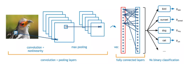 现在假设有一张鸟的图像,你想确定它是真的鸟还是其他什么东西。你应该做的第一件事是以数组的形式将图像的像素馈送到神经网络(用于对此类事物进行分类的 MLP 网络)的输入层。 隐藏层通过执行各种计算和操作来进行特征提取。有多个隐藏层,如卷积、ReLU 和从图像中执行特征提取的池化层。 最后,你可以看到一个全连接层,它可以识别图像中的确切对象。 你可以很容易的从下图理解:
