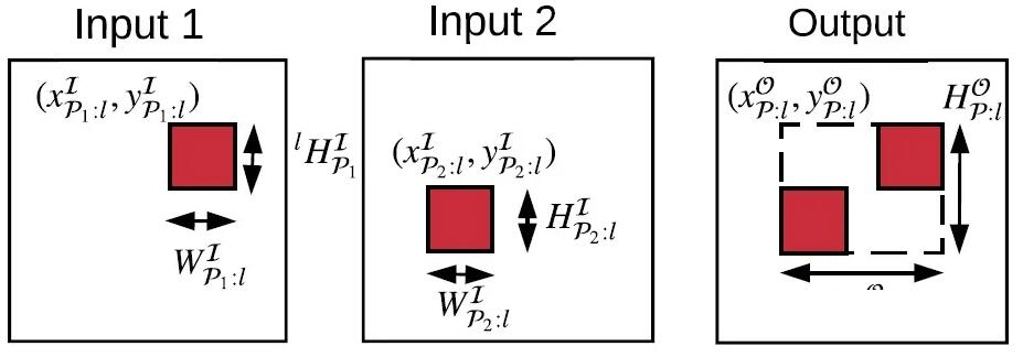 公式(21)给出了计算输出更新窗口的横坐标和宽度的方法(这里也省去了y维的公式),可以看到,如果我们用1个方形窗口(称为“输入遮挡窗口”)将2个输入遮挡片圈起来,那么输入更新窗口的坐标和范围其实和这个输入遮挡窗口是一样的。很显然,这种处理方法可以用于更复杂的单元级加法或深度级串联的应用场景,我们只需要将输入更新窗口扩展为3维的输入更新块,让输入更新块能把所有发生变化的像素点都圈起来即可。