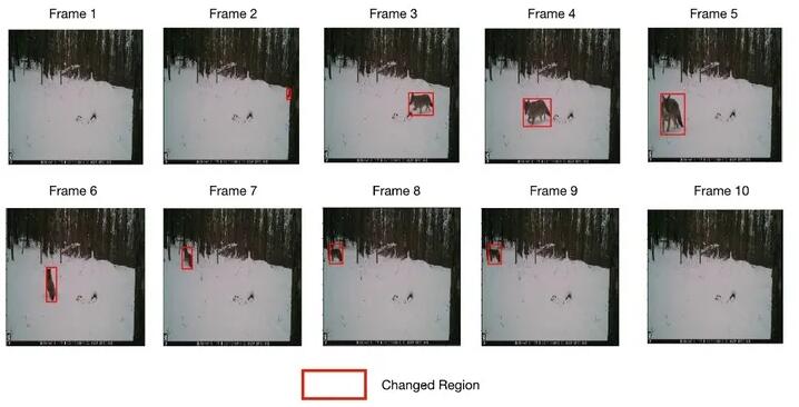 ORV就比较好理解了,它其实就是使用CNN来识别出视频中的物体。ORV一般用于安全监视、交通监控、野外动物种类追踪等应用场景,对于这些应用场景,摄像头的位置和角度是固定的,因此拍摄到的视频的背景往往都是固定不变的。在这种情况下,由于视频的每帧图像是不变的或渐变的,我们需要关注的其实只是图像中变化的部分。图2给出了一个使用跟踪摄像机来追踪野外动物的应用,可以看到,在没有动物进入摄像机的“视野”时,视频图像的画面是不变的,恒定为背景画面(即环境背景);在动物进入摄像机的“视野”后,图像发生了变化,CNN可以检测到这种变化,并使用红框圈出了变化区域,且能一直跟踪动物的移动;最后,动物离开了摄像机的“视野”,视频画面又回到了最初的背景画面。