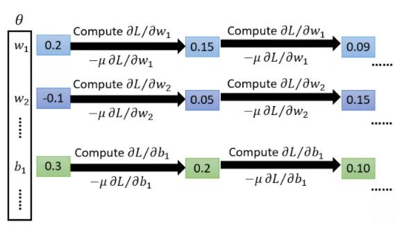 具体流程:??是一组包含权重和偏差的参数集合,随机找一个初始值,接下来计算一下每个参数对应的偏微分,得到的一个偏微分的集合???就是梯度,有了这些偏微分,我们就可以更新梯度得到新的参数,这样不断反复进行,就能得到一组参数使得损失函数的值最小。