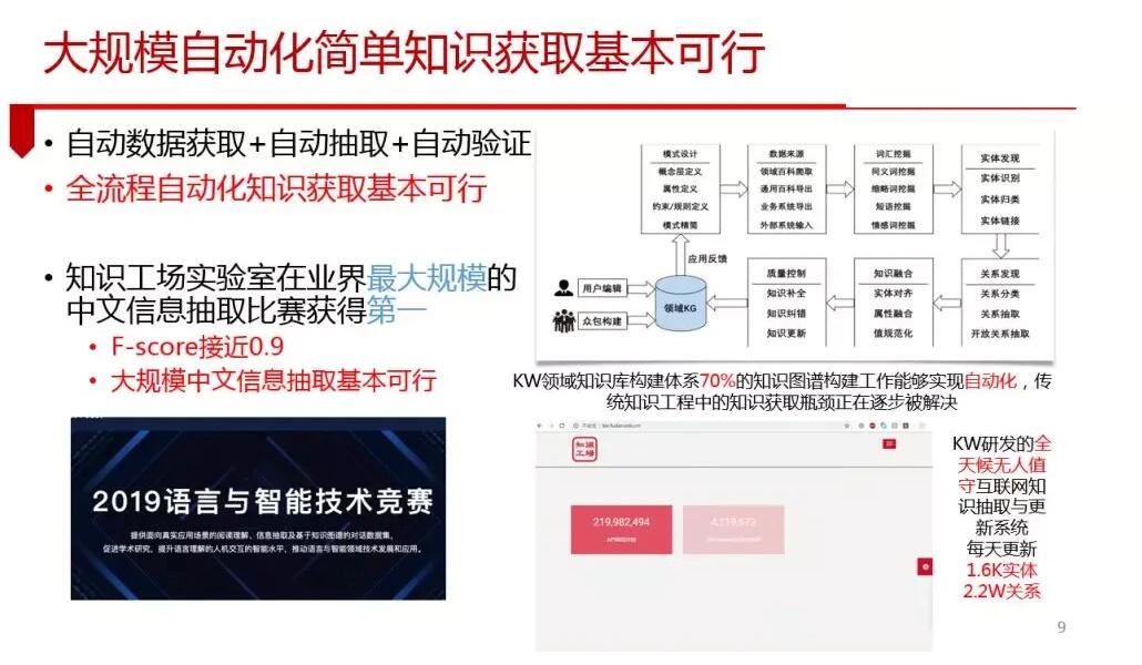 90%+已经没有问题,大家可以看到华为云、百度云都已经推出了这项服务。还有基于知识的问答等实用化关键技术都取得了突破。还有,在自然语言处理中,知识支撑下的知识问答、行业问答已经有了一个非常长足的进步,这实际上都是基于知识图谱的支撑做到的。
