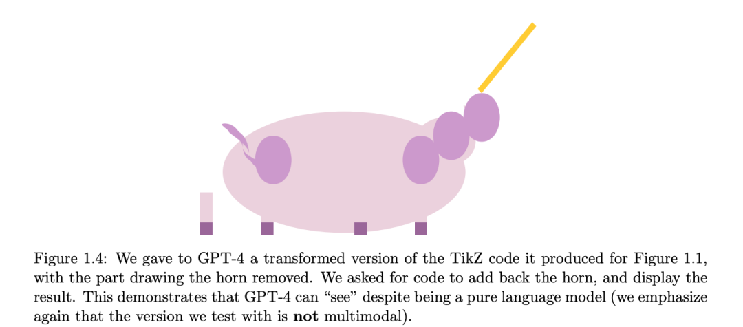 因此,以上图为例,当研究人员把独角兽角部分的代码认为删除之后,用自然语言让 GPT-4 生成时,它也能做到“看”(此时测试的