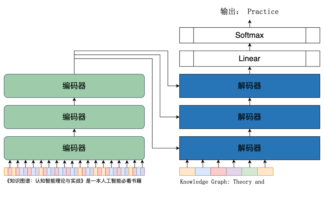 图7展示了一个中文到英文翻译的序列到序列的实例——将中文“《知识图谱:认知智能理论与实战》是一本人工智能必看书籍”翻译为英文“Knowledge