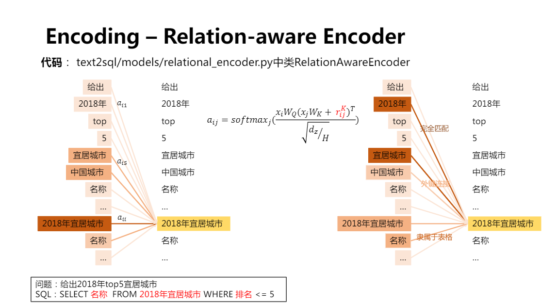 匹配关系增强编码:利用SchemaLinking 中建立起来的关系矩阵,来指导编码,进而强化编码,