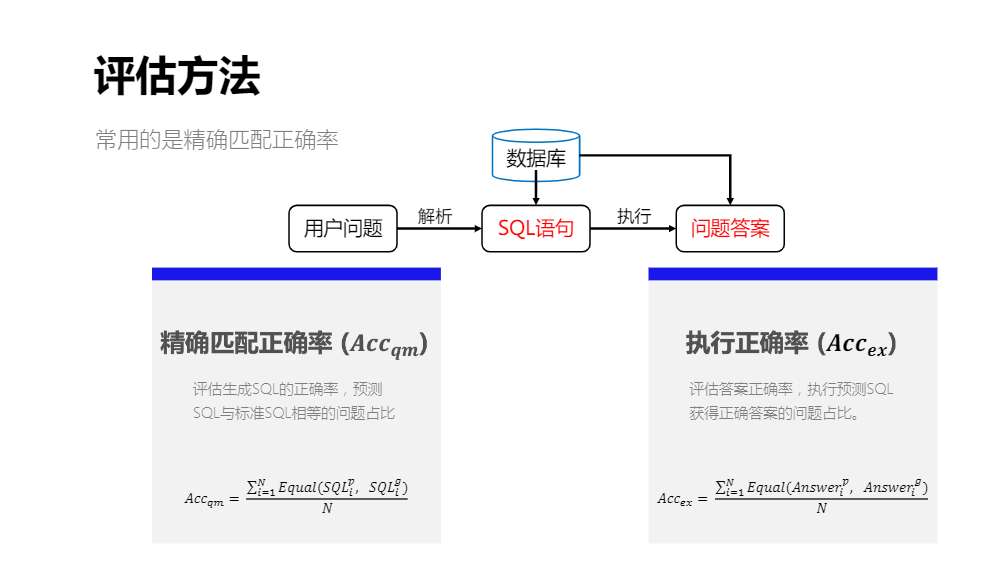 精确匹配正确率:评估生成的SQL的正确率,预测SQL与标准SQL相等的问题占比