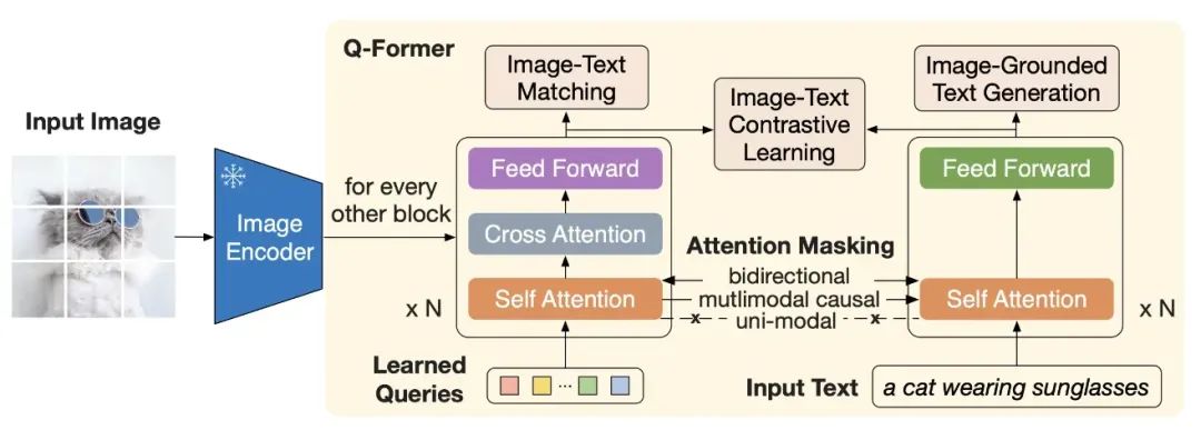 BLIP2 里面一样的视觉模块,包含一个 ViT 模块和一个 Q-Former 模块。模型的整体框架如下所示,我们从下往上看:首先一张图片会经过视觉模块(ViT&Q-Former)进行编码得到一个图像