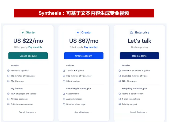 30分钟的视频制作。 针对企业用户,Synthesia 则根据公司需求设定定制化的收费方案, 费用主要与使用者数量相关。
