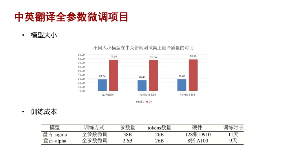 指标方面其实大家的差距很小,但是大模型主要强在它的人工感受这块,也就是大模型的翻译结果是更好的,因为它更地道一些、更自然一些。我们最终的盘古大模型的微调效果在人工评测上还是会比ChatGPT