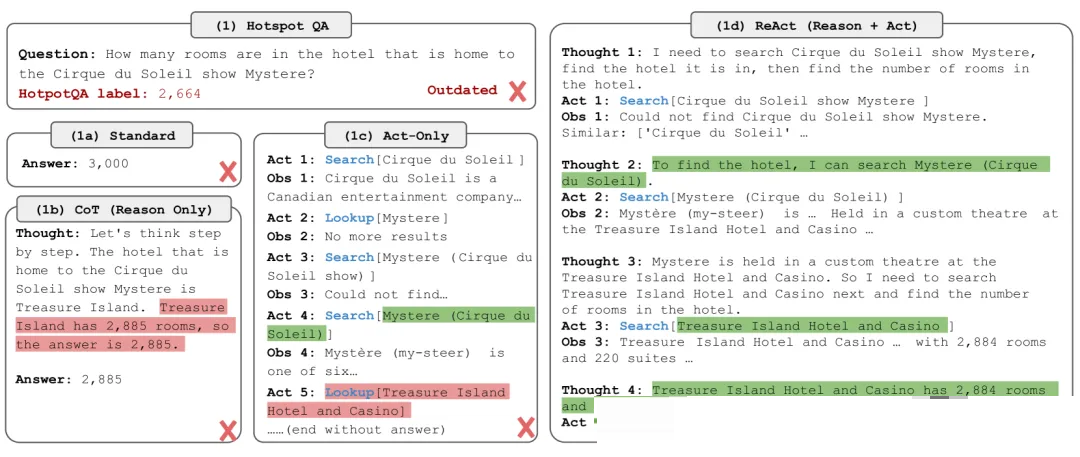 推理是认知的基石,是使人能够做出决策、解决问题并理解周围的世界的关键能力。Agent如果想要在复杂环境中有效互动、自主决策,并在各种任务中协助人类,就必须具备强大的推理能力。“行动”与“推理”之间的紧密协作,使得Agent能够快速学习新任务,并在未知情境或信息不确定的情况下,进行稳健的决策或推理。此外,代理还需要推理能力来根据新的反馈或学到的信息调整其计划。如果Agent缺乏推理能力,可能会在执行简单任务时误解查询、基于字面理解生成响应,或未能考虑到多步骤的影响。