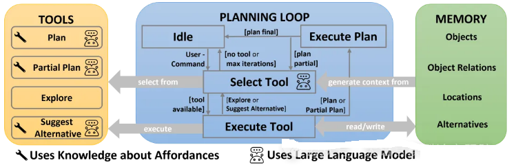 AutoGPT + P也是一种解决大语言模型在Agent应用推理限制的方法。这种方法使得Agent能够寻找环境中缺失的物品,提出替代方案,或向用户寻求帮助以达成目标。AutoGPT+P的操作始于利用场景图像来识别物体。随后,语言模型依据这些信息从四种工具中选择其一:计划工具、部分计划工具、候选计划工具和探索工具。这些工具使机器人不仅能生成完成目标的完整计划,还能探索环境、做出假设并制定部分计划。然而,语言模型并非完全独立生成计划。它负责生成目标和步骤,与一个执行计划的经典规划器协同,该规划器使用规划领域定义语言(PDDL)。AutoGPT