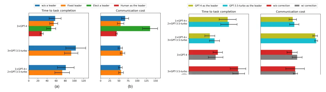 这个框架的作者发现:当领队是人类时,团队的效能最佳。文章还强调了在计划生成、表现评估、反馈提供和团队重组中采用“批评-反思”步骤的重要性。研究结果表明,具有动态轮换领导结构的团队在任务完成时间和平均沟通成本上都取得了最佳表现。总而言之,领导力和动态团队结构显著提升了团队在推理、规划和任务执行上的整体能力。