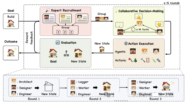 多Agent架构AgentVerse 通过明确的团队规划阶段来增强AI Agent的推理和问题解决能力。AgentVerse将任务执行过程分为四个主要阶段:招募、协作决策、独立行动执行和评估,直至达到最终目标。通过为每个阶段设定清晰的框架,AgentVerse引导代理团队更高效地进行逻辑推理、讨论和行动。