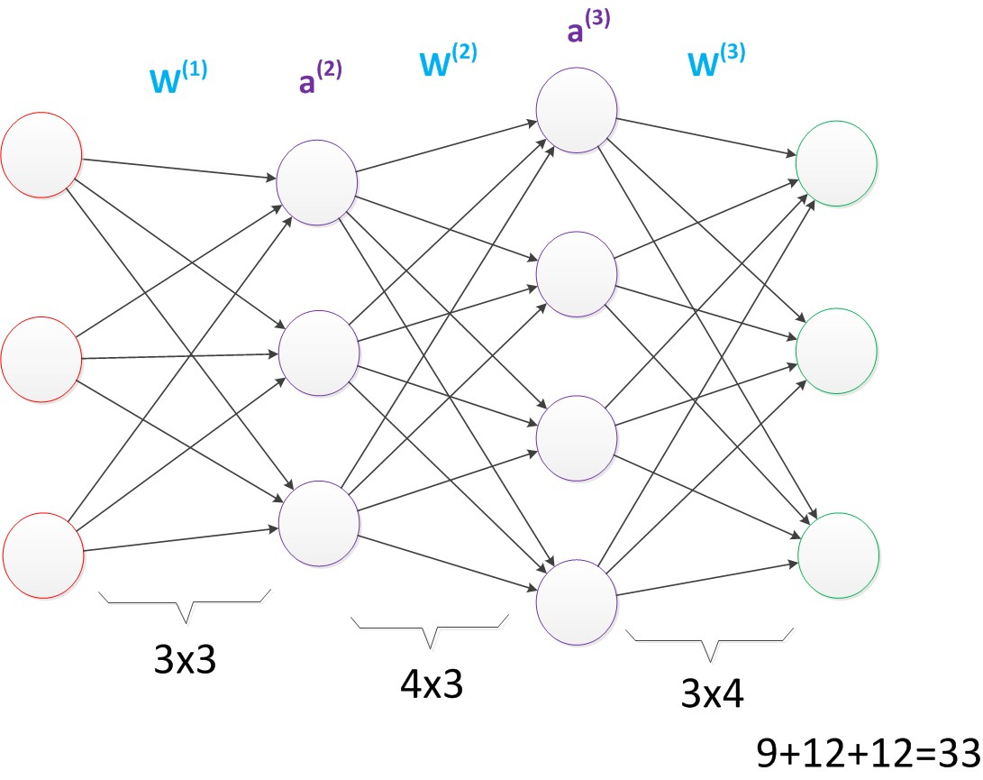 让我们来看一个经典的神经网络。这是一个包含三个层次的神经网络。红色的是输入层,绿色的是输出层,紫色的是中间层(也叫隐藏层)。输入层有3个输入单元,隐藏层有4个单元,输出层有2个单元。后文中,我们统一使用这种颜色来表达神经网络的结构。