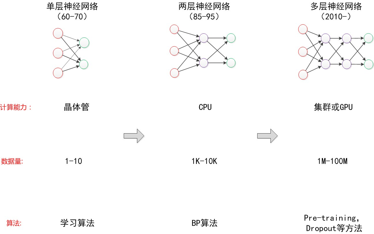 从单层神经网络(感知器)开始,到包含一个隐藏层的两层神经网络,再到多层的深度神经网络,一共有三次兴起过程。详见下图。