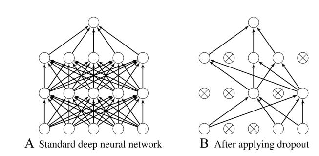Dropout的思想就是在每次训练的迭代过程中,以某个概率p pp随机地让神经网络中的部分神经元灭活(可以看作是删除这些节点)。它减少了神经元之间的相互依赖,可以被看作是训练多个结构不同但是参数共享的神经网络,有效的避免了过拟合。需要注意的是,在建立好模型,用测试集进行测试的时候,不再采用dropout的方式,而是保留全部神经元进行测试。