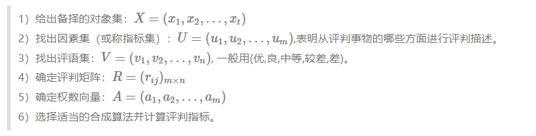 1965年,美国加利福尼亚大学的控制论专家查德,第一次成功地运用精确的数学方法描述了模糊概念,宣告了模糊数学的诞生。模糊综合评判(FCE)是就是以模糊数学为基础,应用模糊关系合成的原理,将一些边界不清,不易定量的因素定量化一种综合评价方法。分为如下步骤: