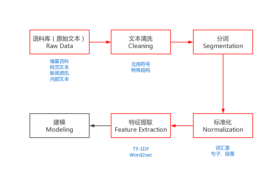 图中红色的部分就是NLP任务的预处理流程,有别于其它机器学习任务的流程