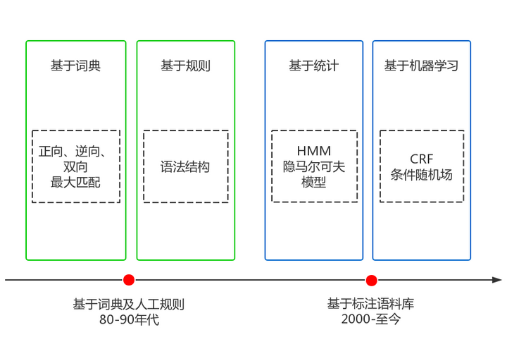 中文分词经历了20多年的发展,克服了重重困难,取得了巨大的进步,大体可以划分成两个阶段,如下图所示: