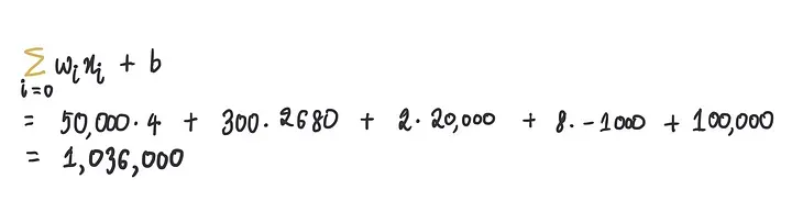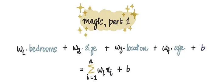 第一部分是求和,在这里我们将每个输入与其对应的权重相乘,然后将它们相加。