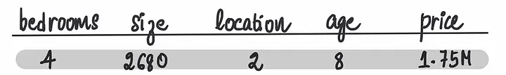 所以,我们可以建立一个神经网络,根据某些特征(如房屋面积(以平方英尺为单位)、位置(1=城市,2=郊区,3=乡村)、房龄和房间数量)来预测房屋价格。