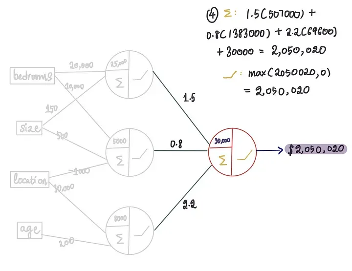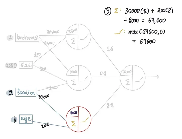 假设我们神经网络的训练过程确定了只有卧室和大小特征与神经元1是相关的,而其他两个特征则不被考虑,那么进入第一个神经元的地点和年龄的权重将为0。