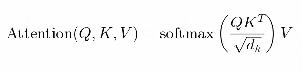 那么这三个向量是如何得到注意力的权重的?让我们来到“探险家”的计算过程中。“探险家”所提供的Q,会分别与序列中的其他token的K计算点积,获得与其他token的语义相似度,进而得到注意力的分数,公式如下(T是矩阵转置,目的是匹配矩阵的维度,dk是K的维度,除以其平方根是为了缩放点积,确保数值稳定)