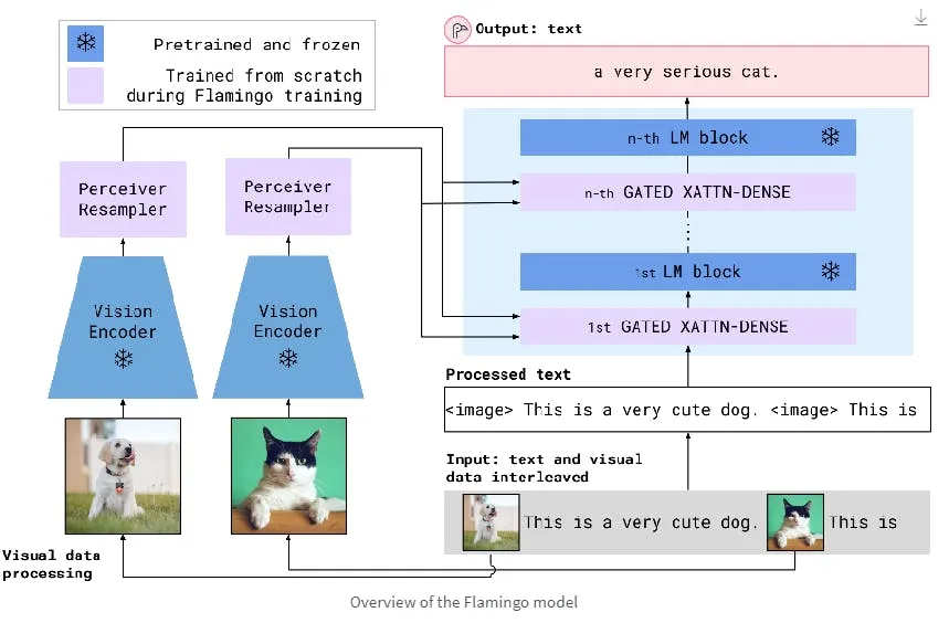 视觉编码器通过感知器采样器处理图像。该技术可加快推理速度,使 Flamingo 成为小样本学习的理想选择。