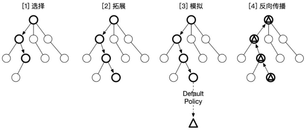 (Expansion),模拟 (Simulation),反向传播 (Back Propagation)。在选择阶段,递归选择最优子节点,当到达一个叶子结点时,若叶子结点不是终止节点,就创建其他节点,选择其一进行拓展,从拓展节点开始,进行模拟输出,直到游戏结束,根据模拟结果,反向传播更新当前序列,该方法的好处在于:可以在不训练模型的情况下,通过增加模型的推理时间,增强模型的推理性能。[10][11][12]。