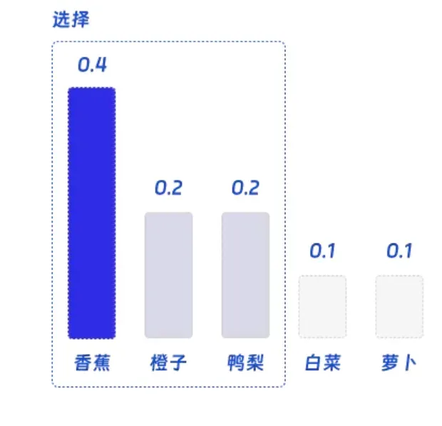 0.4 的概率,为橙子分配 0.2 的概率,为鸭梨分配 0.2 的概率,为白菜分配 0.1 的概率,为萝卜分配