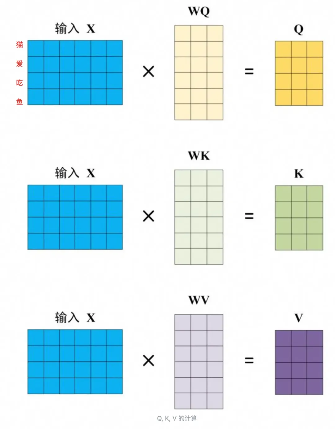 Transformer 的重点是 Self-Attention 结构,其中用到的 Q, K, V矩阵通过输出进行线性变换得到。