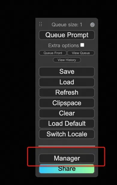 这个时候直接点击【Manager】,即可对ComfyUI进行可视化操作管理: