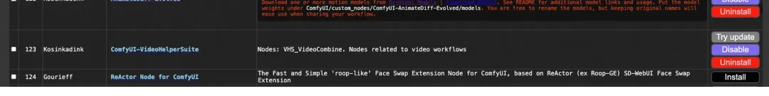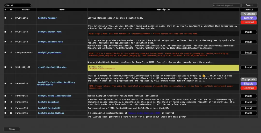 在这个界面下,可以进行Custom Node的安装升级,以及模型的下载等。