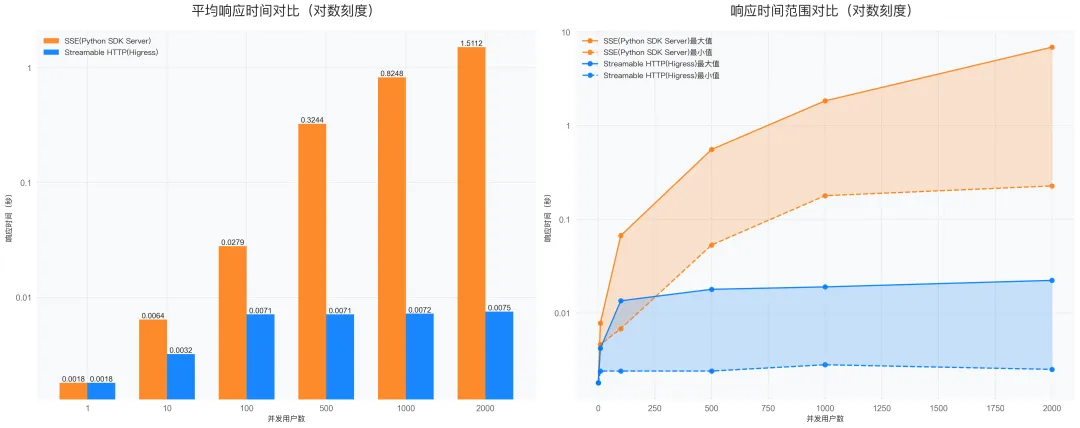利用 Python 程序模拟不同数量的用户同时并发访问远程的 MCP Server 并调用获取工具列表,并统计调用返回响应的时间,图中给出的响应时间对比为对数刻度,SSE