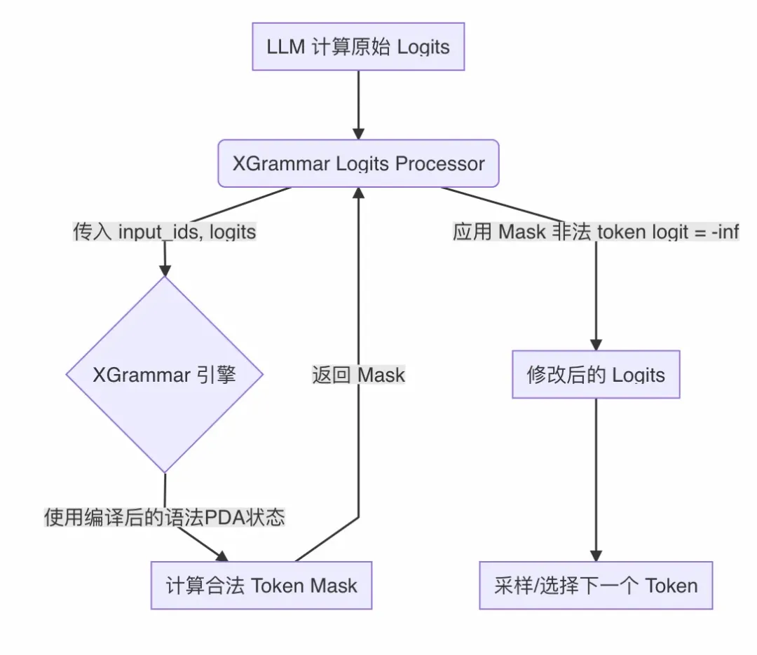 的每个解码步骤中修改 token 的概率分布 (logits)。我们将 XGrammar 的约束逻辑封装在此处理器中,实现对生成过程的实时干预。