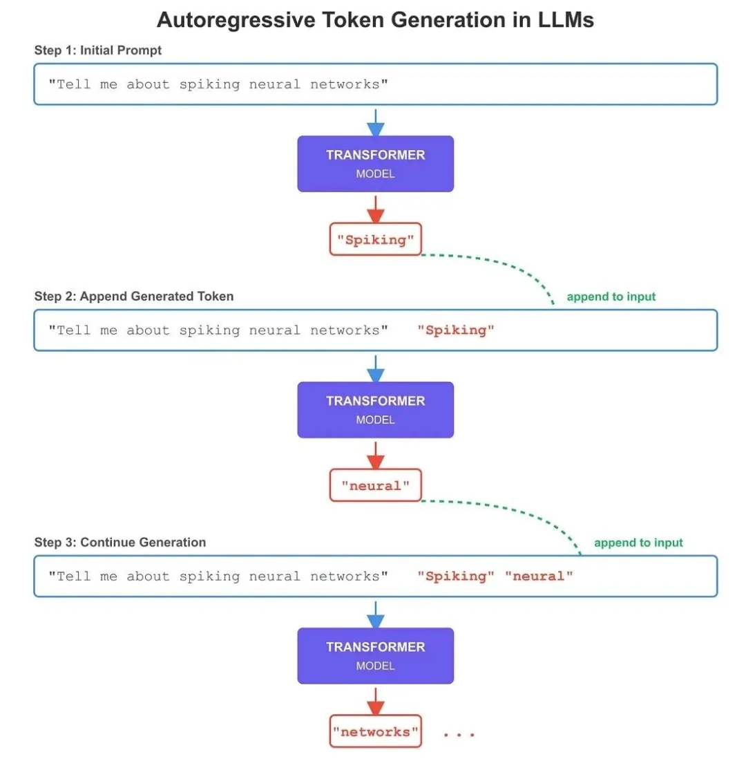 每生成一个token后,我们会将“此前生成的token”添加到“输入提示词末尾”,以此更新输入内容。这类利用“先前生成的token”来生成“新token”的模型,被称为自回归模型(以GPT系列为代表)。