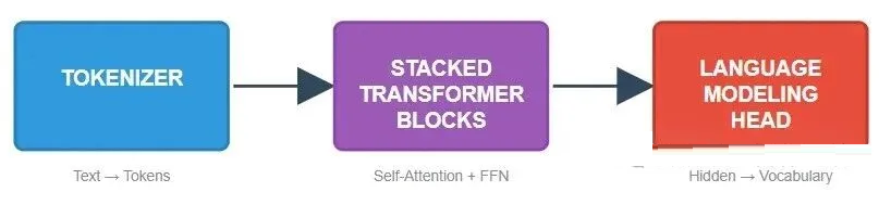 接下来,我们拆解大语言模型的架构。从宏观层面看,大语言模型包含三部分:token解析器(Tokenizer)
