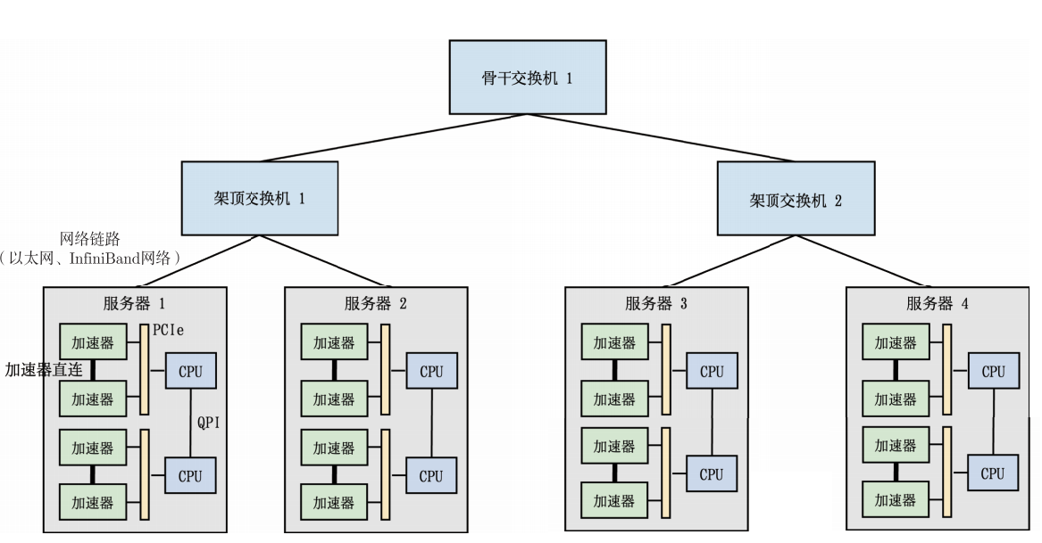 在大规模人工智能模型的训练过程中,往往需要借助高性能计算集群(HPC 集群)。这类集群就像一座超级工厂,里面有成百上千台服务器,每台服务器都装有多个计算加速设备(通常是 GPU),数量一般在 2 到 16 个之间。
