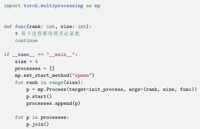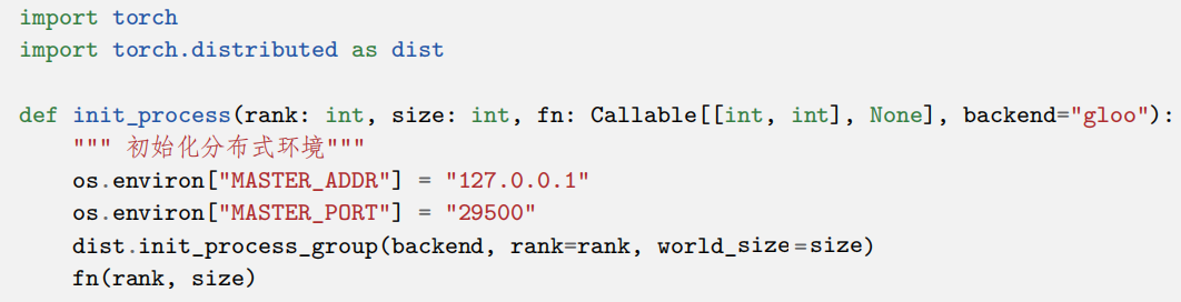以 PyTorch 为例,介绍如何使用上述通信原语完成多计算设备间通信。先使用“ torch.distributed ”初始化分布式环境: