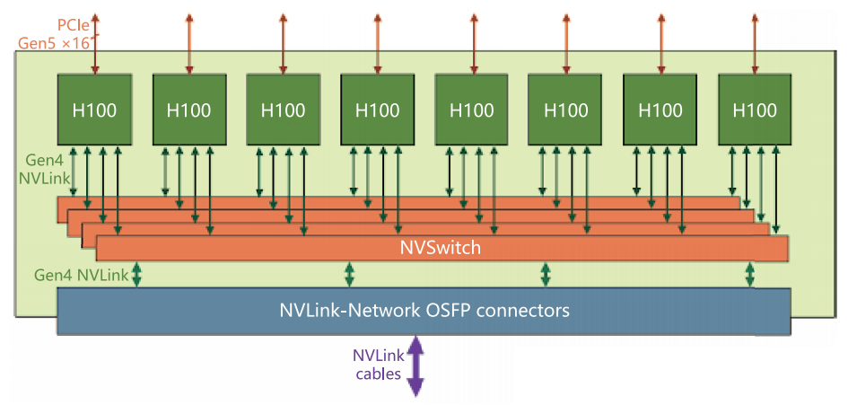 以 NVIDIA 的 HGX H100 8-GPU 服务器为例:每张 H100 GPU 都通过多个 NVLink 端口连接到 4 个 NVSwitch 上。NVSwitch 是一种无阻塞交换机,可以把所有 8 张 GPU 全部互联起来。这样一来,无论哪两张 GPU 之间通信,都能实现高达 900GB/s 的双向速度。换句话说,在服务器内部,GPU 之间的数据传输几乎没有障碍。