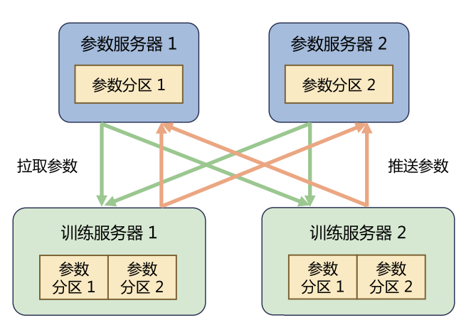 比如,有一个模型被分成两个部分(参数分区),那么就会用两个参数服务器分别管理这两部分参数。在训练过程中,每个训练服务器都会加载完整的模型,然后根据分配到的数据切片(Dataset Shard)做计算,得到的梯度会推送给对应的参数服务器。
