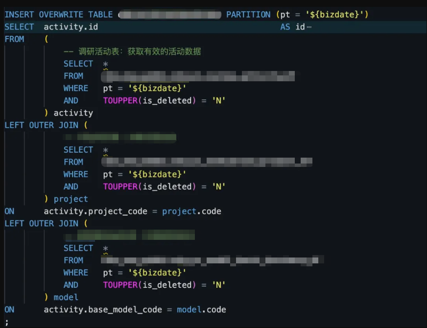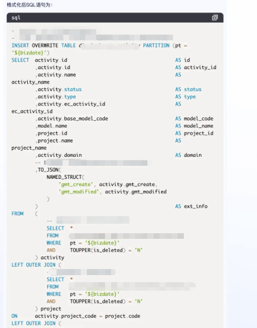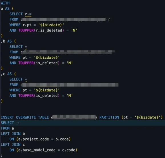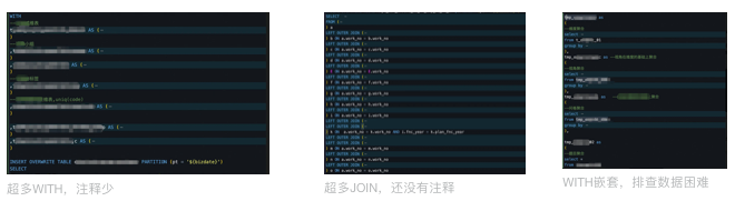 小D的模型重构完了,他通知下游同学修改下依赖,下游同学打开自己负责的任务一看...这是什么历史代码连基本对齐都没有,根本 看不懂,想一键格式化,结果发现d2上的格式化真的就只是一键对齐,好像帮我改了又好像没啥效果...... 许多规范性的代码问题根本无法解决:比如 代码无注释、超长加工逻辑、多层WITH嵌套等等,严重影响到工作中的协作开发效率......