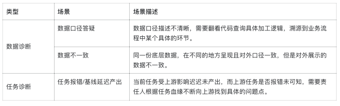 日常工作过程中,除了将业务的需求按期高质量交付,我们也需要保障数据和任务的稳定性,而不影响线上数据的产出,当出现问题时,我们希望【问题排查】可以自动帮我们定位到问题点,减少我们耗时费力的排查过程。