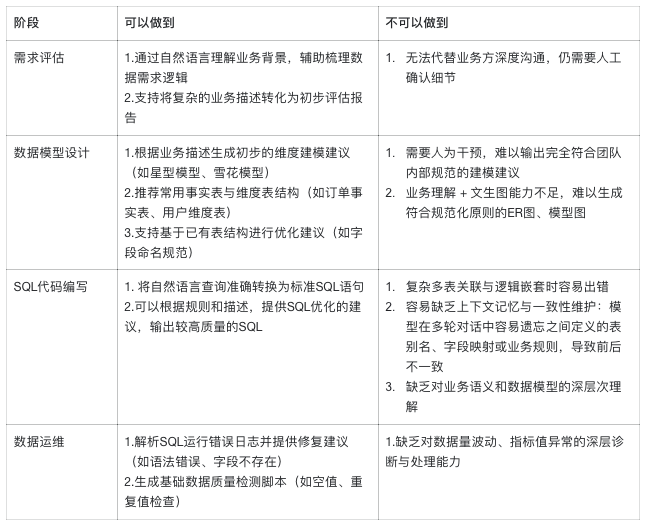在集团内部,尽管 数据百晓生 已通过自动化技术实现数据表的检索与答疑,并且利用LLM构建AI数据助手实现了“找数-取数-用数”的全链路覆盖; D2 Copilot亦支持SQL/Python代码生成与改写等功能,但若想进一步利用大模型实现需求评估、模型评审、CodeReview、代码规范改写及问题排查等场景,仍需攻克以下核心问题: