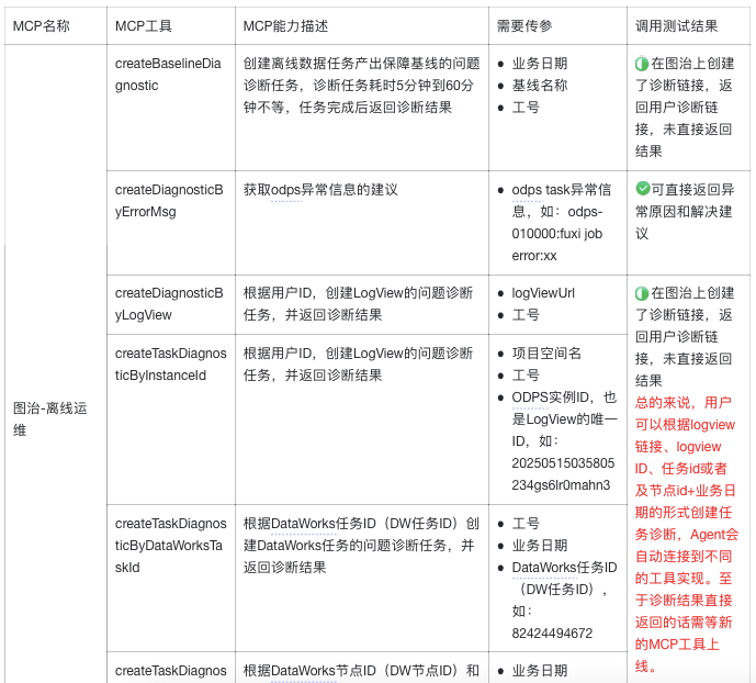 在实际场景中,我们的任务未挂载到基线上,任务又受上游影响(我们非上游任务负责人)延迟产出而没及时被通知时,需要我们自行进入到运维中心,根据任务血缘不断往上找到问题所在。即使是让Agent来帮我们排查问题,也需要能够获取到任务实例状态,因此我们借助图治的诊断能力来帮我们实现这部分功能,图治近期上线了离线运维的MCP能力,正好支持我们在AI Studio上调用。