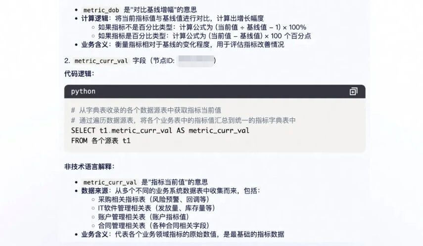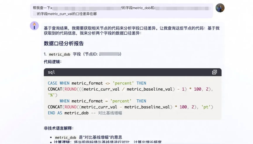 基于这个通用型Agent,在【问题排查】场景中,我们只需要调用该Agent来帮我们查出异常字段/表的各上游节点,并根据字段血缘深度,由大模型帮我们梳理出相关字段的加工逻辑,从而辅助我们的口径答疑。