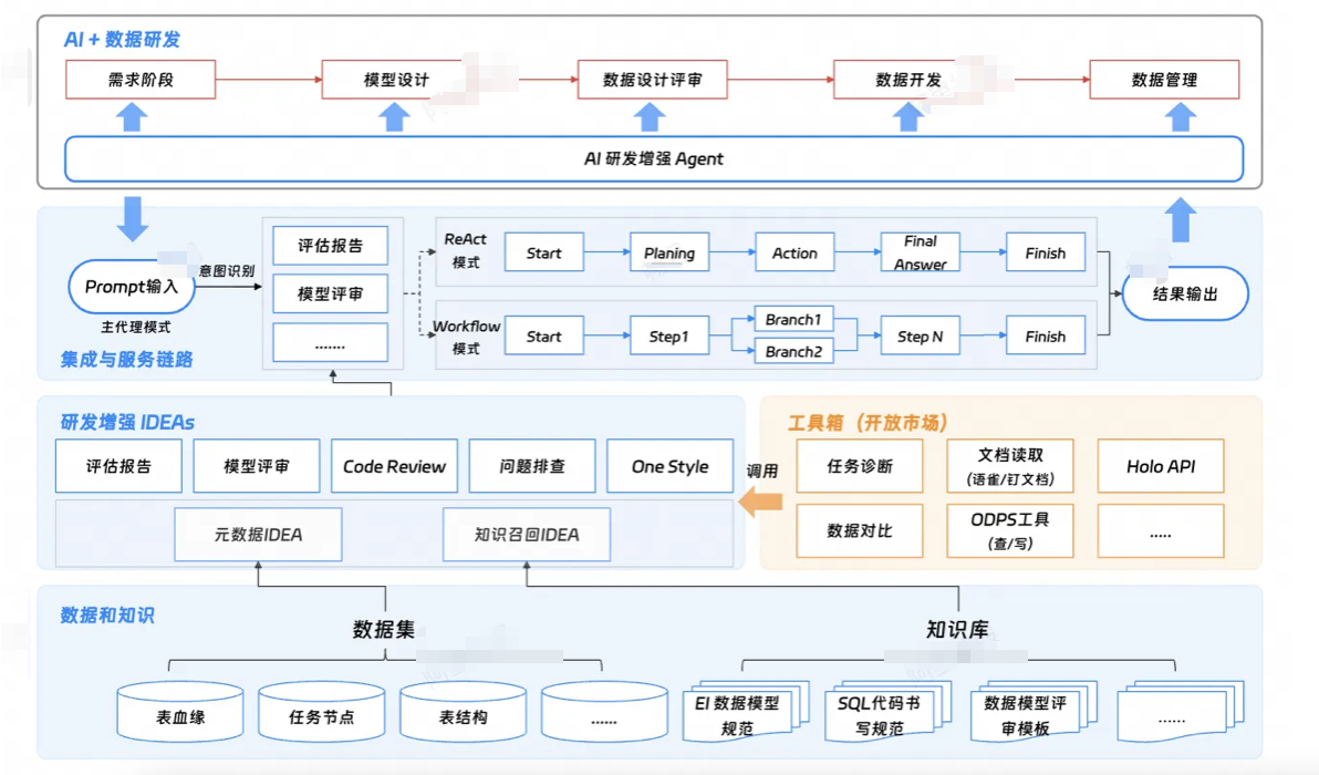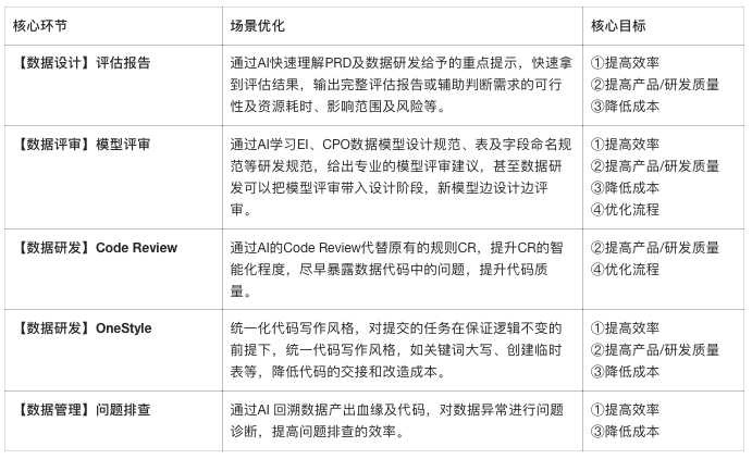 在以上这些丰富的能力加持下,我们希望构建一个面向 数据研发全链路的智能Agent,通过AI能力去帮助【评估设计】->【模型评审】->【数据研发】->【数据运维】四大核心环节实现提效,把数据研发同学最耗时、执行效率低或者效果较差的五个场景作为先行切入点: