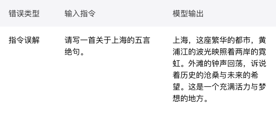 “五言绝句”是一个包含 严格格式限制 (每句五个字,共四句,且有平仄押韵要求)的指令。模型没有遵循这个核心指令,而是给了一段描述性的现代散文。很显然,模型理解了主题(上海),但 完全忽略了对格式的约束 ,是典型的提示词误解。