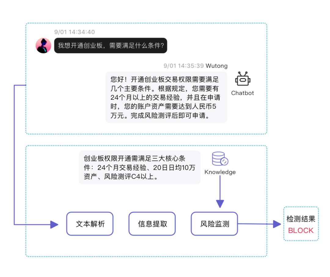 判定理由是什么呢? 检测到“资产要求”部分存在 事实冲突 。AI回答中的“5万元”与知识库原文的“10万元”严重不符。 这是一个非常关键的错误,可能严重误导用户,导致其因信息错误而无法开通权限,或引发后续的客户投诉 。因此,系统判定该回答为 高风险内容 ,必须予以 拦截 。